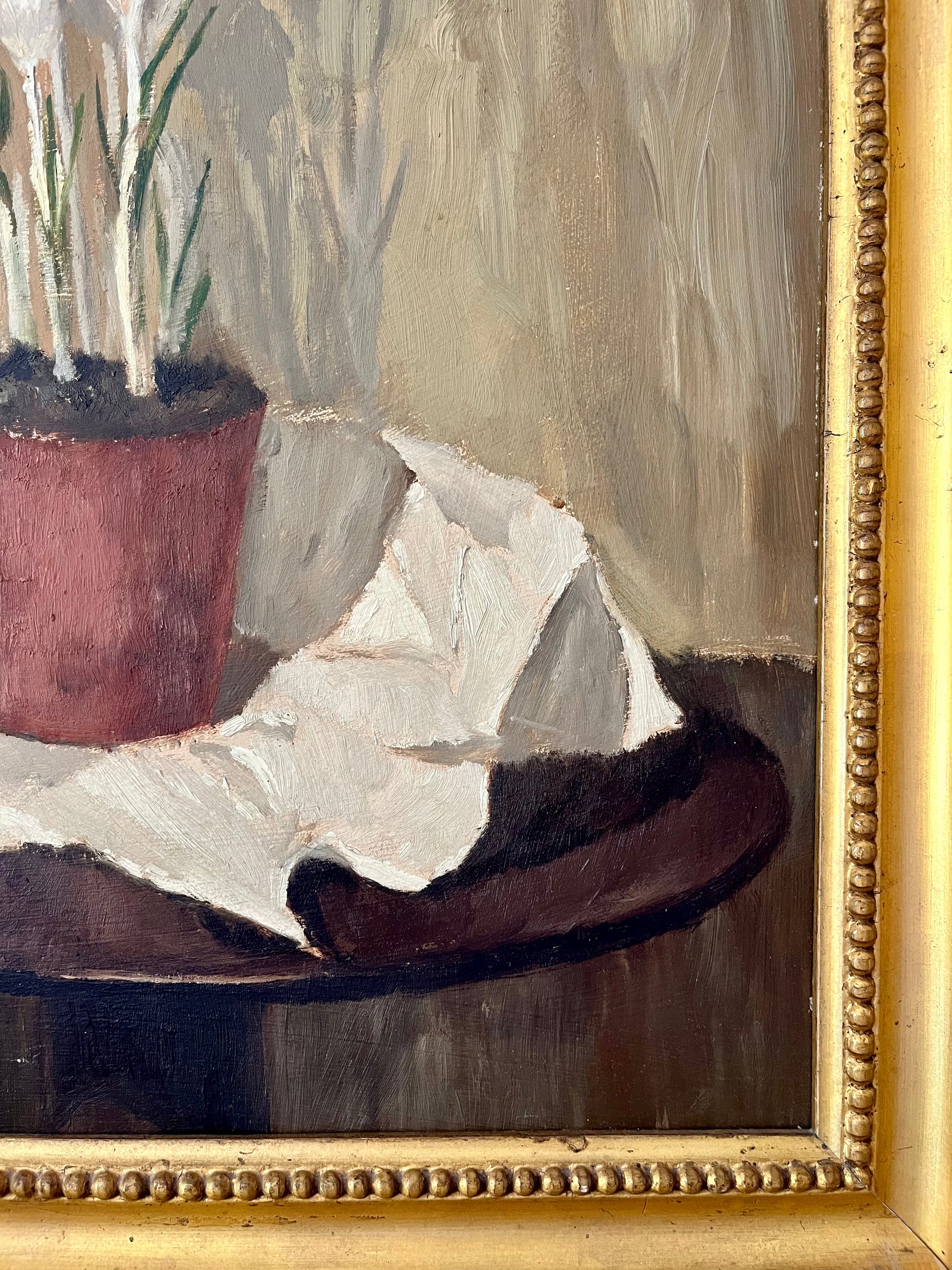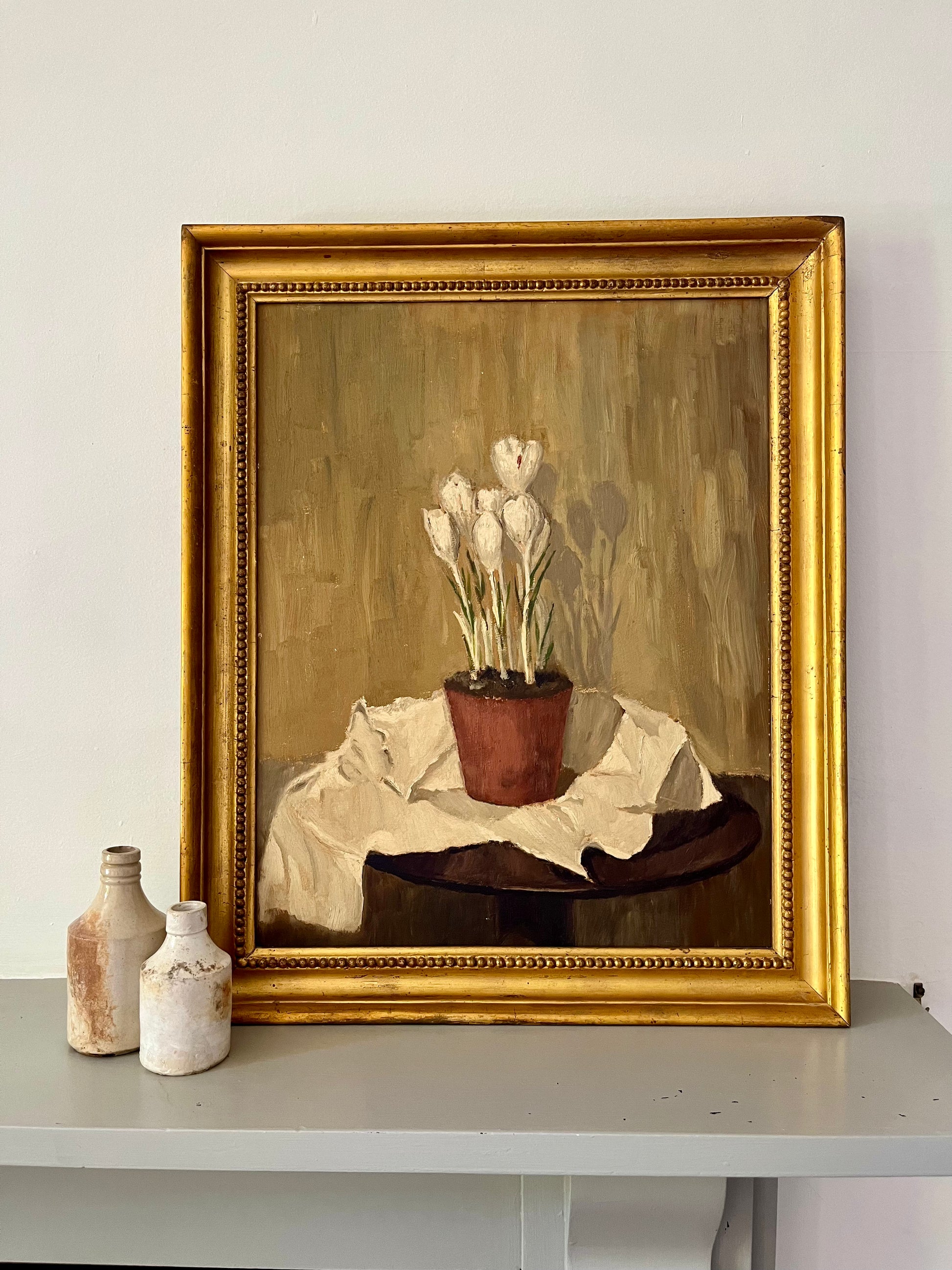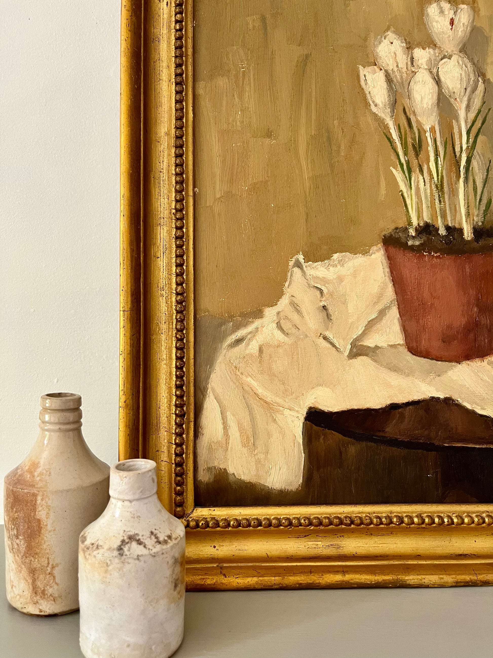 Still life of potted white crocus.